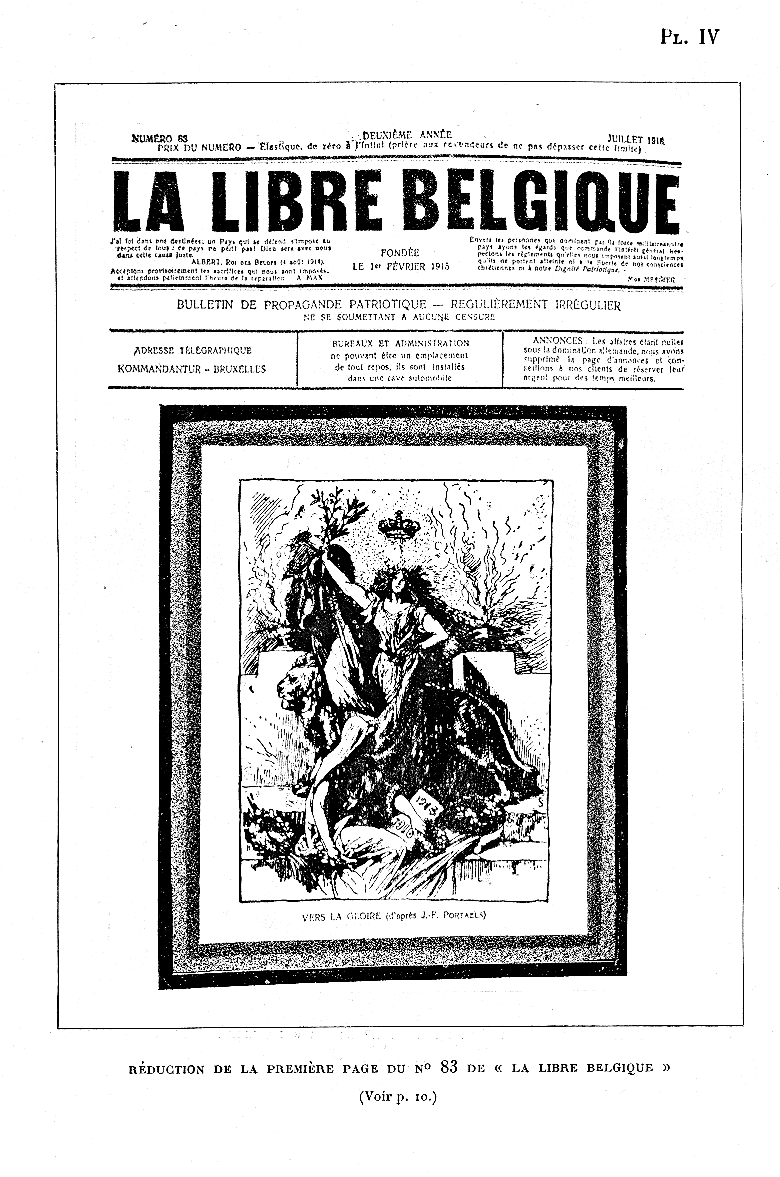 De temps en temps, la première page du journal est illustrée. Le n° 50 nous montre Guillaume II en enfer, d'après le tableau bien connu d'Ant. Wiertz, «Napoléon en enfer». Le n° 52 donne un bon portrait du roi Albert. Le numéro anniversaire (n° 62) nous montre le pauvre baron von Bissing au milieu d'une montagne de mandats de perquisitions destinés à mettre la main sur les rédacteurs de La Libre Belgique; on y représente aussi la cave automobile où siège la rédaction, celle où fonctionne la machine à imprimer et celle où se fait l'emballage; puis la perquisition dans un water-closet et l'arrestation de la statue d'André Vésale (voir page suivante et pl. II). Le n° 83, «censuré le 21 juillet 1916», donne à l'occasion de la fête nationale belge un dessin, «Vers la gloire», entouré d'un cadre aux couleurs belges (pl. IV). Le n° 81 publie une reproduction d'une carte illustrée qui a été vendue en Allemagne, avec le lion belge chevauché par un Prussien (pl. III).