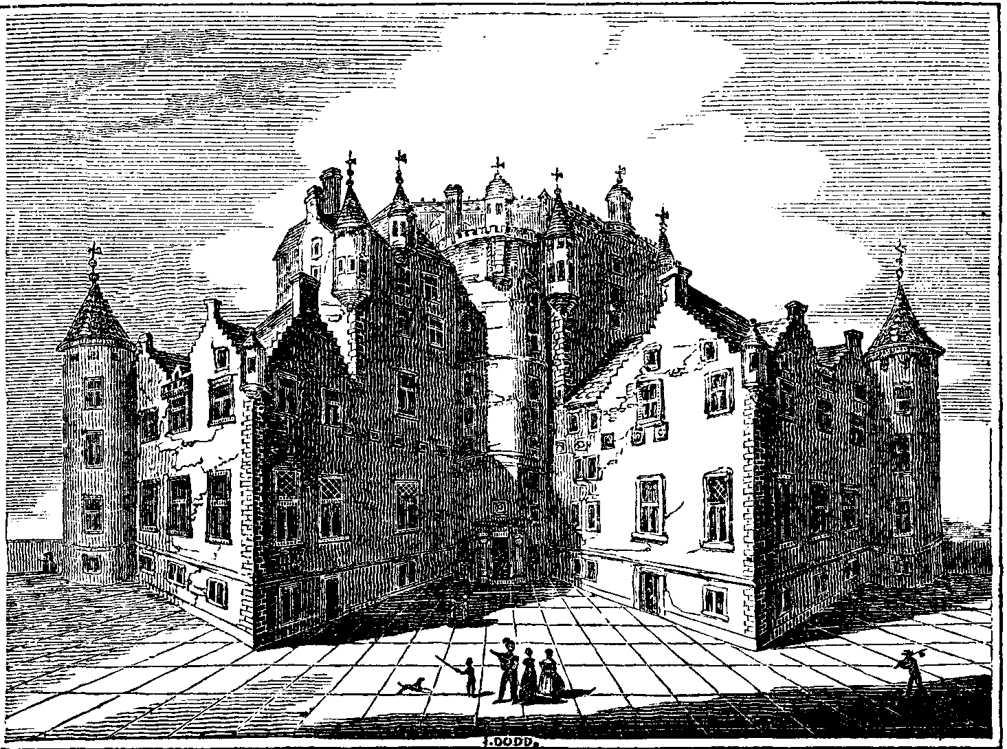 Glammis Castle is still the seat of the Strathmore family. It was given by Robert I. of Scotland, in the year 1376, with his daughter, to John Lyon, Lord Glammis, chancellor of Scotland. Great alterations and additions were made to the building by Patrick, Earl of Strathmore, his lineal heir and successor: these improvements, according to the above cited plan, a date carved on a stone on the outside of the building, and other authorities, were made in the year 1606, and not in 1686, as is said in an old print engraved about that time, and from which our view is copied. The architect employed on this occasion, as tradition reports, was Inigo Jones; indeed, the work seems greatly to resemble Heriot's Hall at Edinburgh, and other buildings designed by him. The great hall was finished in the year 1621; it is a handsome room with a [pg 226] carved ceiling, adorned with heads and ornaments in stucco. Among the apartments shown to visitors, are a wardrobe containing a curious collection of old state dresses; the armoury, in which are preserved the sword and coat of mail of Macbeth, as well as some articles supposed to have been carried off by Malcolm's murderers, and found in the Loch of Forfar, during the last century; and the chapel built about 1500, the furniture of which remains in its original state. Here also are about one hundred portraits; among which is a large picture, in a carved frame, representing Earl Patrick and his three sons; in the background is a view of the castle, as it was in the year 1683. At that time there were three gates leading from the park. Some idea may be formed of the extent of this establishment from the circumstance of eighty beds being made up within the house, for the Pretender and his retinue, during their sojourn here, besides those for the inferior servants, in the offices out of doors. The forfeiture of the estate was prevented by the earl's brother being killed at the head of his regiment on Shiremore.