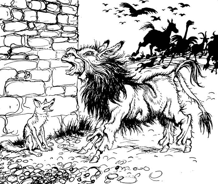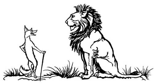 A Lion lay sick in his den, unable to provide himself with food. So he said to his friend the Fox, who came to ask how he did, "My good friend, I wish you would go to yonder wood and beguile the big Stag, who lives there, to come to my den: I have a fancy to make my dinner off a stag's heart and brains." The Fox went to the wood and found the Stag and said to him, "My dear sir, you're in luck. You know the Lion, our King: well, he's at the point of death, and has appointed you his successor to rule over the beasts. I hope you won't forget that I was the first to bring you the good news. And now I must be going back to him; and, if you take my advice, you'll come too and be with him at the last." The Stag was highly flattered, and followed the Fox to the Lion's den, suspecting nothing. No sooner had he got inside than the Lion sprang upon him, but he misjudged his spring, and the Stag got away with only his ears torn, and returned as fast as he could to the shelter of the wood. The Fox was much mortified, and the Lion, too, was dreadfully disappointed, for he was getting very hungry in spite of his illness. So he begged the Fox to have another try at coaxing the Stag to his den. "It'll be almost impossible this time," said the Fox, "but I'll try"; and off he went to the wood a second time, and found the Stag resting and trying to recover from his fright. As soon as he saw the Fox he cried, "You scoundrel, what do you mean by trying to lure me to my death like that? Take yourself off, or I'll do you to death with my horns." But the Fox was entirely shameless. "What a coward you were," said he; "surely you didn't think the Lion meant any harm? Why, he was only going to whisper some royal secrets into your ear when you went off like a scared rabbit. You have rather disgusted him, and I'm not sure he won't make the wolf King instead, unless you come back at once and show you've got some spirit. I promise you he won't hurt you, and I will be your faithful servant." The Stag was foolish enough to be persuaded to return, and this time the Lion made no mistake, but overpowered him, and feasted right royally upon his carcase. The Fox, meanwhile, watched his chance and, when the Lion wasn't looking, filched away the brains to reward him for his trouble. Presently the Lion began searching for them, of course without success: and the Fox, who was watching him, said, "I don't think it's much use your looking for the brains: a creature who twice walked into a Lion's den can't have got any."