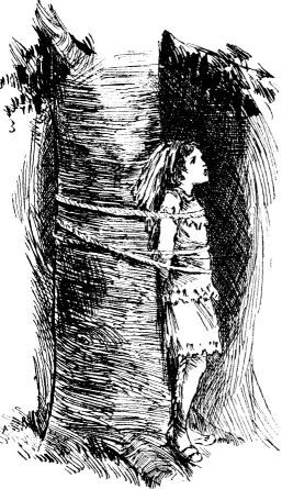 When the boys had been gone fifteen minutes she thought they must have been away hours. At the end of half an hour she was wild with impatience to get loose, but, thinking they might return any minute, she made no sign of her discomfort. She would be as heroic as the bravest brave ever tortured by cruel savages. As long as it was light she kept up her courage, but presently it began to grow dark under the great beech-trees. A frog down by the spring set up a dismal croaking. What if they should not come back, and her grandmother and Aunt Allison should miss the train, and have to stay in the city all night! Then nobody would come to set her free, and she would have to stay in the lonely woods all by herself, tied to a tree, with her hands behind her back.