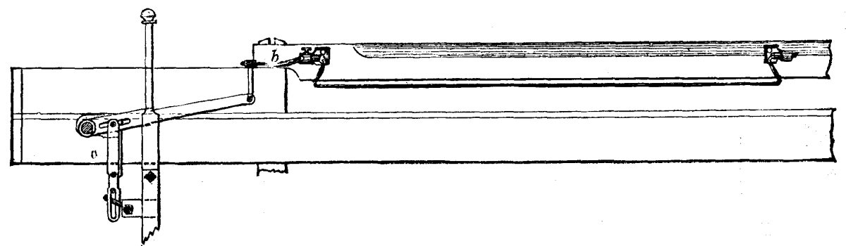 The annexed illustration shows the essential parts of Hahlo and Liebreich's improvement, the loom being now at work. The handrail, shuttle race, and starting handle can be at once recognized, and the shuttle guard will be seen in its proper position, which position it rigidly retains as long as the loom is working, but on a stoppage the rod swings back close underneath the handrail, and quite clear of the reed. The mode in which this is accomplished we will endeavor to make clear. The guard is connected to the starting lever by the arrangement shown, consisting of a stud on the handle, on which, with the movement of the slay, lever, a, slides. This lever, by means of another lever and a link, is attached to the shuttle guard by the crank, b, which, by means of the set screw in the boss, permits the shuttle guard to be adjusted in the most convenient place. It will be observed that whenever the loom stops working, whether it is stopped by hand or automatically, the hand lever has to be moved, and this movement is communicated to the shuttle guard by the mechanism just described, placing the guard rod beneath the hand rail, and leaving the whole of the shuttle race free and unencumbered. The act of starting the loom brings the guard again to the working position without any extra act having to be performed by the weaver. The action is entirely automatic, and the weaver has not anything to do that she has not to do with the present unguarded looms. The arrangement appeared to ourselves to be a very efficient one, and it has the merit that the length of the guard can be made greater than the width of the cloth, a further advantage that will be recognized by practical weavers.