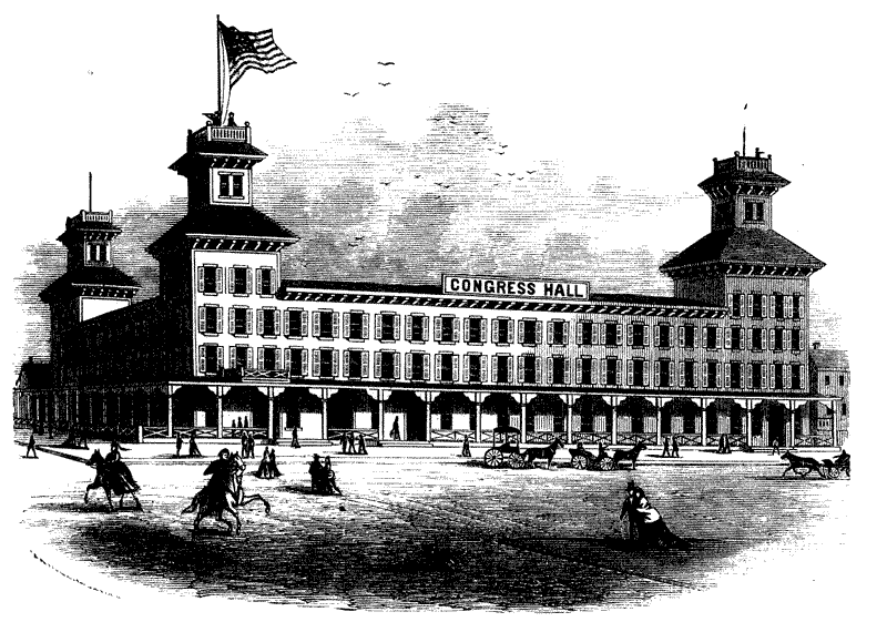 Some years ago the Surf House was [pg 616] the finest place of entertainment, but it has now many rivals, taller if not finer. Congress Hall, under the management of Mr. G.W. Hinkle, is a universal favorite, while the Senate House, standing under the shadow of the lighthouse, has the advantage of being the nearest to the beach of all the hotels. Both are ample and hospitable hostelries, where you are led persuasively through the Eleusinian mystery of the Philadelphia cuisine. Schaufler's is an especial resort of our German fellow-citizens, who may there be seen enjoying themselves in the manner depicted by our artist, while concocting—as we are warned by M. Henri Kowalski—the ambitious schemes which they conceal under their ordinary enveloppe débonnaire.