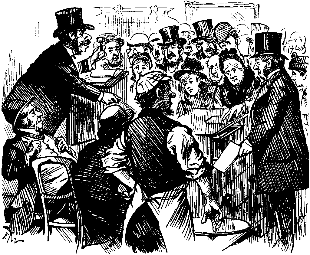 No doubt HOWORTH was, though undesignedly, originator of the business. Saw in incident of Hartlepool election an opening for minimising effect. Wrapped purpose up in form of question addressed to ATTORNEY-GENERAL. Question in subtly diplomatic form insinuated against FURNESS charge of breach of Corrupt Practice Act. ATTORNEY-GENERAL, knowing that HOWORTH is the man who pulls the strings of statecraft, not only in Salford and London, but in Berlin and St. Petersburg, did not venture to decline to answer; gravely played up to his lead. Opposition laughed and cheered; saw their opening, and have since diligently filled it. Scarcely day passed since that questions on hypothetical cases, addressed to ATTORNEY-GENERAL, have not appeared on Orders. As they are moulded on HOWORTH's, which he answered fully, even genially, difficult to refuse reply. But there must be a limit to this kind of thing; reached to-day when caustic CAUSTON comes forward with request for gratuitous opinion on case submitted, involving difficult question of eligibility of Catholics for seat on Woolsack. SUMMERS, who, depressed by Irish domestic difficulty, hasn't put a question for three weeks, goaded into activity; puts down another on same subject. Mr. ATTORNEY respectfully declines to answer either. Opposition yell with derisive cheers.