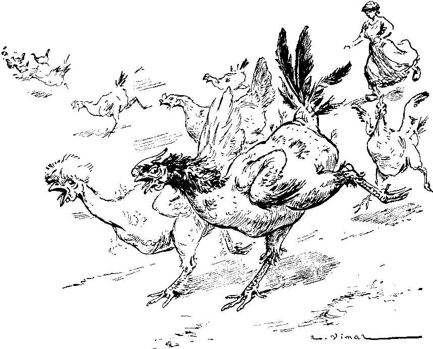 Meanwhile, Yollande was eating her heart out. She rushed to and fro, keeping her eyes glued on the disobedient ones. Suddenly she saw a mother-duck chasing her darlings. This was more than she could bear,—driven by her maternal instinct she leapt like a fury to the aid of her family.