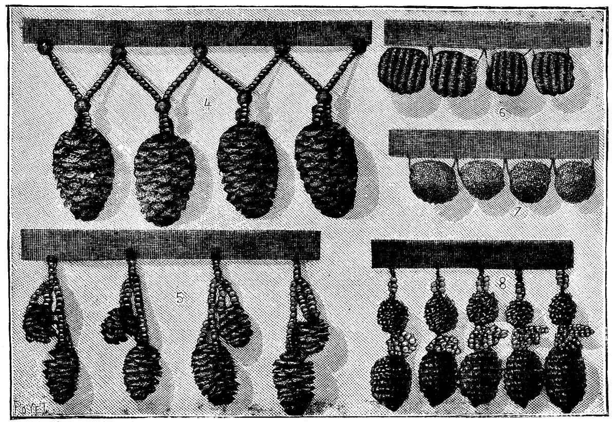FIG. 1.—DRESS TRIMMINGS OF FRUITS AND SEEDS. 1. Seeds of Casuarina and fruit of alder. 2. Acorn cup, involcure of beech, and pod of medick. 3. Fruit of Eucalyptus, cups of acorns, Job’s tears, and cones of cypress.