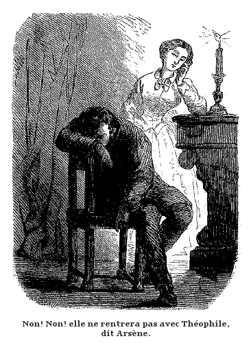 «Au fait, dit-il, ce ne peut être qu'elle, et je suis un grand sot de n'avoir pas compris pourquoi vous étiez si embarrassés tout à l'heure devant la vieille fée qui emportait l'enfant... Mais l'enfant?... Ah! l'enfant!... j'y suis! la vieille a très-nettement dit son père en parlant d'Arsène... l'enfant de huit mois... car il a huit mois, vous me l'avez dit ce matin, Eugénie!... et il y a neuf mois que Marthe m'a quitté, si j'ai bonne mémoire... Vive Dieu! voilà un dénoûment sublime et dont je ne m'étais pas avisé dans mon roman!»