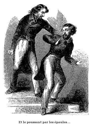A la vue d'une goutte de sang qui vint rougir le beau bras de Marthe, Horace, convaincu qu'il l'avait assassinée, essaya de se poignarder lui-même. J'ignore s'il aurait poussé jusque-là son désespoir; mais à peine avait-il effleuré son gilet, qu'un homme, ou plutôt un spectre qui lui parut sortir de la muraille, s'élança sur lui le désarma, et, le poussant par les épaules, le précipita dans les escaliers en lui criant avec un rire amer: