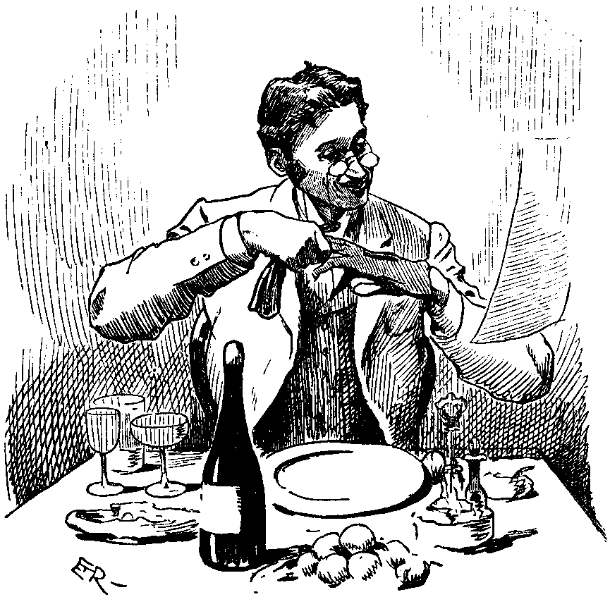 "Petzikoff! Blass the Prince of WAILES!" sings out DAUBINET, whose Mark-Tapley-like spirits would probably be only exhilarated by a lonely night in the Catacombs. Then he shakes hands with me violently. In France he insists upon shaking hands on every possible occasion with anybody, in order to convey to his own countrymen the idea of what a thorough Briton he is.