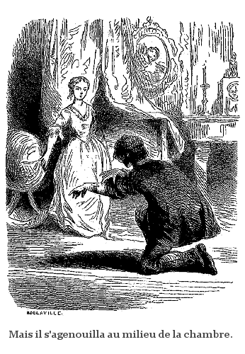 «Monsieur, dit alors madame de Theursan en prenant le bras de Jacques, laissez ma fille aux soins de deux personnes que j'ai la surprise de voir ici, et accordez-moi sur-le-champ un moment d'entretien dans une autre pièce.—Non, Madame, répondit Jacques d'un ton sec et hautain; laissez-moi secourir ma femme moi-même, vous direz ensuite tout ce que vous voudrez devant les deux personnes que voici. Fernande, dit-il en s'adressant à sa femme, qui commençait à revenir un peu, prends courage; c'est tout ce que je te demande en récompense de la tendresse inaltérable que j'ai pour toi. Soigne-toi, conserve-toi pour cet enfant qui nous reste; vois comme il te sourit, notre pauvre fils unique! Tu dois tenir à la vie, tu es encore entourée d'êtres qui te chérissent; Sylvia est là qui attend un effort de ton amitié pour lui rendre ses caresses; je suis à tes pieds pour te conjurer de résister à ta douleur... et... voici Octave.» Il prononça ce dernier mot avec un effort visible. Fernande se jeta dans ses bras, occupée seulement de sa douleur; il avait sur le visage deux grosses larmes, et il me regarda avec un singulier mélange de reproche et de pardon. L'homme étrange! j'eus envie un instant de me jeter à ses pieds.
