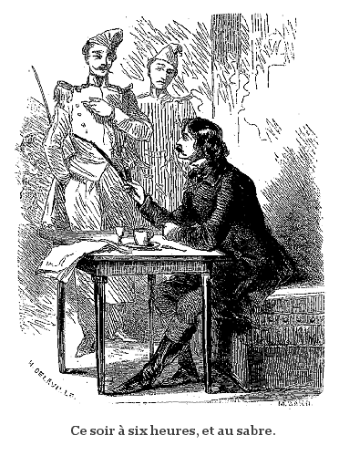 Mon camarade, il faut que vous alliez me remplacer à Tours, sur-le-champ, auprès de Jacques, qui se bat encore ce soir. Je ne puis ni lui servir de témoin, ni même aller vous investir de mes fonctions; j'ai une attaque de goutte si bien conditionnée, qu'il me serait impossible de faire une lieue en voiture. Jacques vient de m'envoyer chercher; allez tout de suite, par la traverse, lui offrir mes excuses et vos services; ces choses-là ne se refusent pas. Je vais tâcher de vous mettre en trois mots au courant de l'affaire. A peine reposé d'avoir tué hier Lorrain, à qui Dieu fasse paix, Jacques s'en va au café comme si de rien n'était; et, avec cette manière glaciale que vous lui connaissez quand il est en colère, il fume sa pipe et prend sa demi-tasse en présence de plus de cent paires de moustaches jeunes et vieilles qui l'examinaient non sans un peu de curiosité, comme vous pensez. Les jeunes officiers qui ont fait la farce que vous savez à l'amant de sa femme, se sont crus insultés ou au moins provoqués par sa présence et par sa figure; ils ont affecté de parler à haute voix des maris trompés en général, et de répéter, à une table voisine de la sienne, le mot qui pouvait flatter le moins les oreilles de Jacques. Comme il restait impassible, ils ont parlé un peu plus clairement de sa femme, et ils ont fini par la désigner si bien, que Jacques s'est levé en disant: «Vous en avez menti,» du ton dont il aurait dit: «Je suis votre serviteur.» Deux de ces messieurs, qui avaient parlé en dernier, se levèrent en demandant à qui s'adressait le démenti. «A tous deux, répondit Jacques; que celui qui voudra m'en demander raison le premier se nomme.—Moi, Philippe de Munck, demain à l'heure que vous voudrez, dit l'un d'eux.—Non pas, reprit Jacques, ce soir, s'il vous plait; car vous êtes deux, et il faut que j'aie le temps de rendre raison à monsieur demain, avant que la police me contrarie.—C'est juste, répondit M. de Munck; ce soir, à six heures et au sabre.—Au sabre, soit,» dit Jacques. Vous voyez que c'est une affaire qui ne peut s'arranger en aucune façon. Deux heures après, j'ai reçu un message de lui pour me prier de lui servir encore de témoin; mais précisément j'ai pris la goutte dans la rosée d'hier à l'affaire de Lorrain, et peut-être ai-je éprouvé aussi un peu d'émotion en voyant tomber ce pauvre diable. Ce n'est pas une grande perte; mais il y avait longtemps que cela grisonnait auprès de nous, et nous ne sommes plus à l'âge où un camarade tombait comme une noix d'un noyer. Ce Jacques est étonnant, et cela prouve bien qu'un homme ne change qu'en dehors: l'arbre ne fait que renouveler son écorce, et Jacques est aujourd'hui le même que nous avons connu il y a vingt ans. On ne dira plus: «Voyez ce que deviennent ces vieux militaires, et comme leurs femmes les font marcher! en voilà un qui se battait pour un coup de crayon, et qui se laisse déshonorer sans rien dire.» Ma foi! je l'ai dit moi-même, et sa situation m'occupait tellement, qu'avant-hier, une heure avant d'apprendre qu'il était ici, je rêvais de lui, et je m'éveillai en criant, à ce que m'a dit ma femme.—«Jacques, Jacques! qu'es-tu devenu!» Mais un homme de coeur se retrouve toujours. Espérons qu'en sortant de là il ira tuer l'amant de sa femme; faites-lui sentir qu'il le doit, que sans cela tout ce qu'il fait maintenant ne sert à rien. Allez vite. Le préfet est un brave garçon qui laisse aller les duels sans faire de tracasserie; pourtant trois affaires en trois jours, c'est plus que ne comporte l'ordonnance, et il pourrait bien arriver que Jacques fût arrêté après la seconde. Il faut qu'il se dépêche. Écrivez-moi par un exprès, ce soir, quand il aura fini avec M. de Munck. J'enrage de n'être pas là; j'aimerais mieux perdre un bras que de voir Jacques manquer à l'appel.