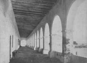 By the side of the Music Room is the Cloistered Walk, divided into sections, in each of which some distinctive epoch or feature of Mission history is represented by mural paintings by modern artists of skill and power. The floor is paved with tiles from one of the abandoned Missions.