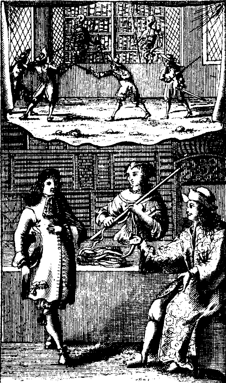 Here you ought to come, O restless Lovers, to behold your selves in these two darlings; you, who in your wooing are also possessed with jealousie, if you see that another obtains access to your Mistriss; or who, perhaps as wel as you, doth but once kiss the knocker of the dore, or cause an Aubade to be plaied under her Chamber Window: Look sharply about you, and behold how these Aubades decline, or whether it be worth your while to give your Rival the Challenge; or to stab, poison, or drown'd your self, to shew, by such an untimely death, the love you had for her; and on your Grave, bear this Epitaph, that through damn'd jealousie you murthered your self. These married Couple, used to do so; but see now what a sad life they live together, because jealousie took root in them so soon, and now bringeth forth such evill fruits.