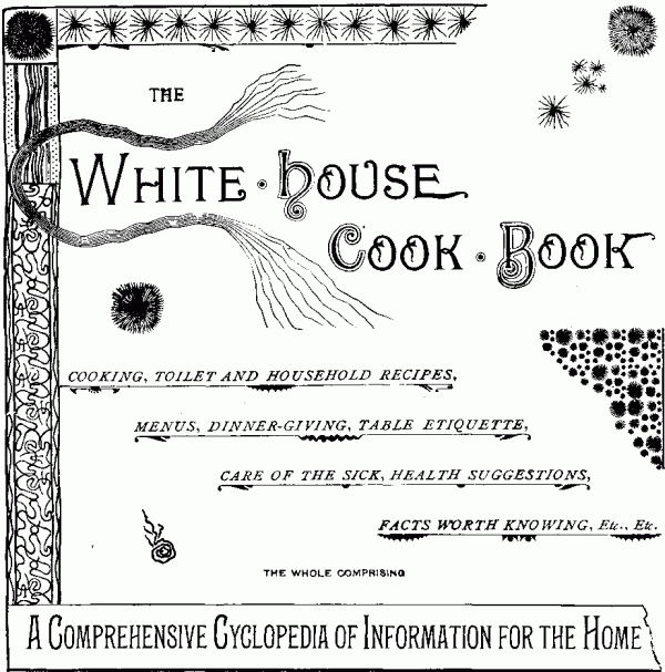 In presenting to the public the "WHITE HOUSE COOK BOOK," the publishers believe they can justly claim that it more fully represents the progress and present perfection of the culinary art than any previous work. In point of authorship, it stands preëminent. Hugo Ziemann was at one time caterer for that Prince Napoleon who was killed while fighting the Zulus in Africa. He was afterwards steward of the famous Hotel Splendide in Paris. Later he conducted the celebrated Brunswick Café in New York, and still later he gave to the Hotel Richelieu, in Chicago, a cuisine which won the applause of even the gourmets of foreign lands. It was here that he laid the famous "spread" to which the chiefs of the warring factions of the Republican Convention sat down in June, 1888, and from which they arose with asperities softened, differences harmonized and victory organized.