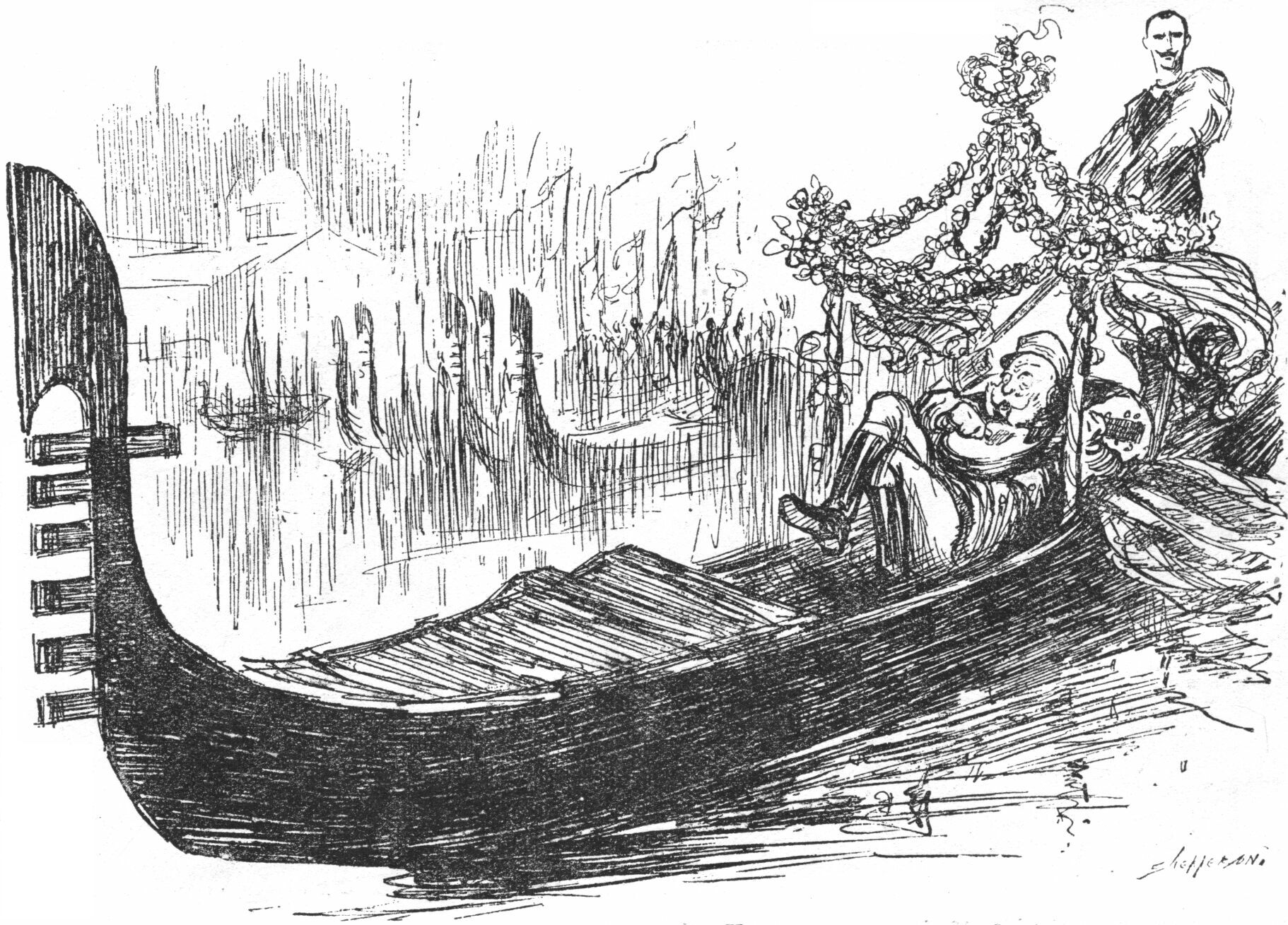 3rd hole (Czernowitch to Brest-Litowski).—CROWN PRINCE, taking the Przaritczow-Blokhod-Strypovitchi line, puts long-range shot into the Pripet Marches. MEHMED, after undermining greater part of the Bukowina, reports progress from the tee. FRANCIS-JOSEPH, reverting to clubs, misses tee-shot twenty-four times and retires exhausted to bath-chair. [pg 31] FERDIE's wind-cheater, badly sliced, trickles into the Warsaw whins and is lost. C.P., arrived at edge of Pripet Marshes, drops another ball, tops it into hazard, throws bag of clubs after it, and sends for another set. Hole abandoned, M. having taken thirty-nine shots and a life-line to get out of the Blokhod Swamp.