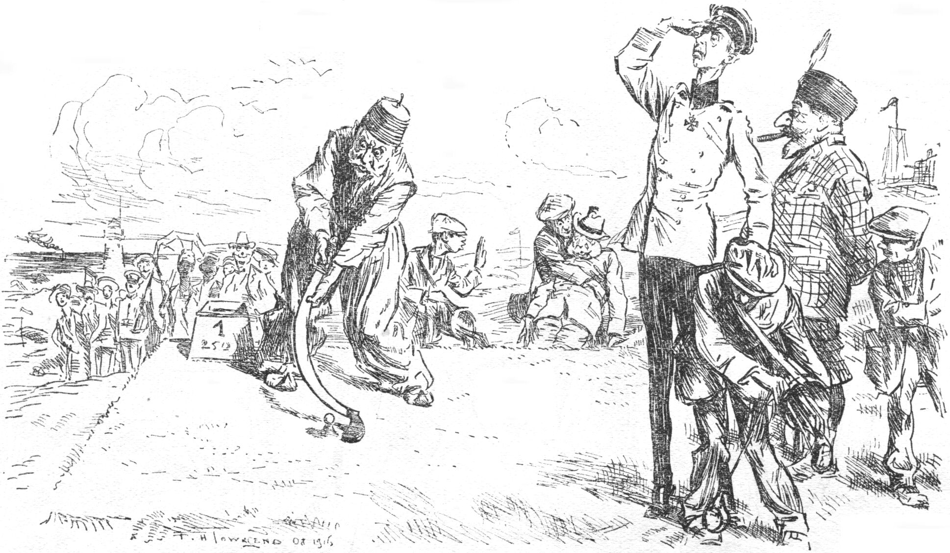 5th Hole (Douaumont to Verdun—long heart-breaking test of golf.)—CROWN PRINCE gives first-hand exhibition of frightfulness and cuts down caddy with a niblick, the miserable fellow having coughed as C.P. was about to drive. MEHMED, who is now taking a larger size in fezzes by reason of performance at last tee, puts eight new balls into the Meuse Burn and gives up. FRANCIS-JOSEPH, still too full of sand to play hole, awaits arrival of vacuum-cleaner. FERDINAND, after twice exploiting the Big Push brassie shot, is suspended for cutting the cloth. C.P. abandons hole (or what is left of it) after missing two-inch putt.
