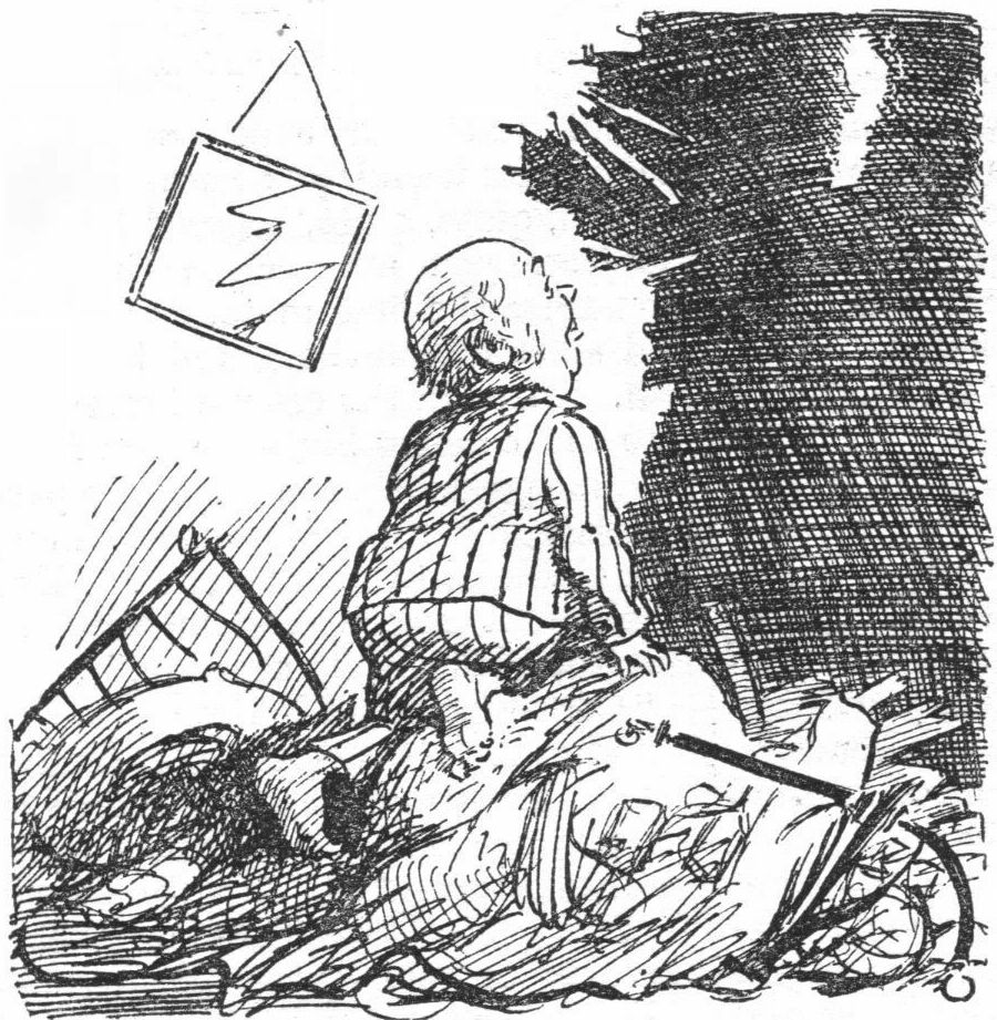 "At last Bill is seized with a notion. He throws himself on to the telephone wires, and, hanging by his hands, manages to convey himself across to the houses on the opposite side of the road. You imitate him. As Bill arrives on the other side, he turns and cuts the wires on which you are crossing. Before the ends of the wires fall, however, you turn a quick somersault and land beside Bill. Once more there is a race over the roofs until Bill reaches a factory chimney. Down the shaft he dives. So do you. Into the furnace below, then out of it, the chase continues—it doesn't pause for a moment."