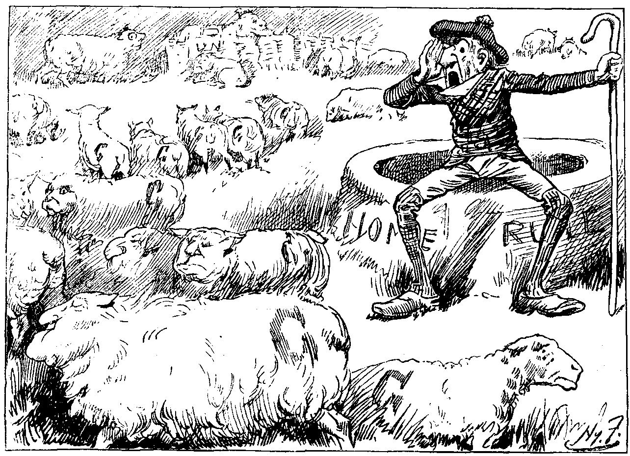 MACLURE, who has been in the confidence of great statesmen from DIZZY downward, tells me Mr. G.'s homeward flight was hastened by curious dream. Dreamt all his sheep were straying from fold; some going one way, others another; each bent on his own particular business. In vain Mr. G. leaping up and taking crook in hand, put hand to mouth and halloed them back to Home-Rule fold. They went their way, some even making for Unionist encampment, where Mr. G., moving heavily in his slumber, distinctly saw one sheep regarding scene through an eyeglass.