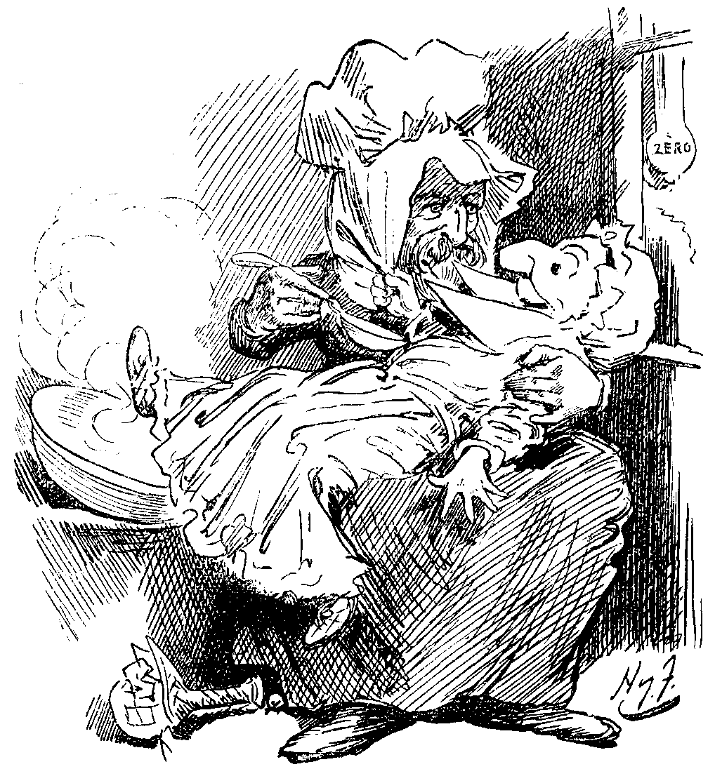 Curious instance of association of ideas and sympathy. So [pg 118] completely is mind of Her Majesty's Ministers occupied with this Fog problem, that to-night it got into House of Commons. LORD ADVOCATE brought in Bill allocating Scotch Local Taxation grant. Debate went on for six hours; at end of that time discovered that whole proceedings irregular. As involving money question, introduction of Bill should have been preceded by Resolution submitted to Committee of whole House. Debate abruptly adjourned; evening wasted; howls of derision from Radicals.
