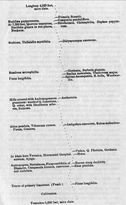 The most common herbaceous family on Muhassoo is Compositæ, and very strange to say, most of its forms, as indeed the others, excepting some of the trees, are found on the Khasyah Mountains at much lower elevations, and much lower latitudes. Of birds the Cone-eater of Bootan occurs.