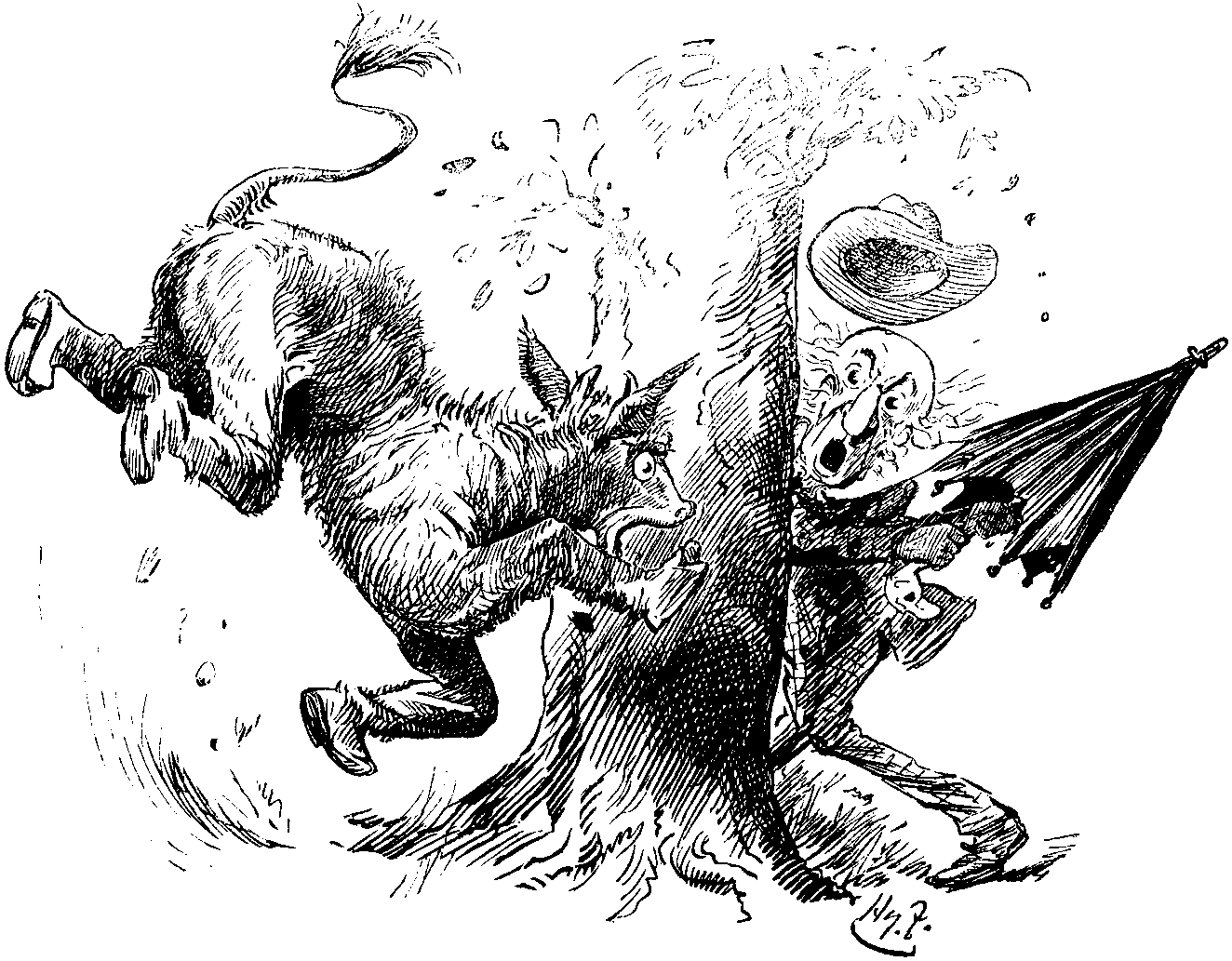[Mr. GLADSTONE met with an extraordinary adventure in Hawarden Park one day last week. A heifer, which had got loose, made for Mr. GLADSTONE as he was crossing the park, and knocked him down. Mr. GLADSTONE took refuge behind a tree. The heifer scampered off, and was subsequently shot.]