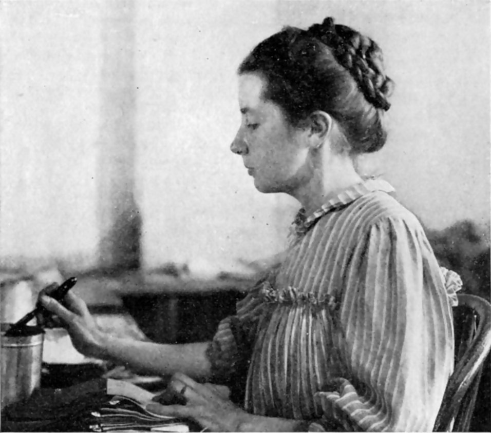 Side by side in rows of tens or twenties we stand before our tables waiting for the seven o'clock whistle to blow. In their white caps and blue frocks and aprons, the girls in my department, like any unfamiliar class, all look alike. My first task is an easy one; anybody could do it. On the stroke of seven my fingers fly. I place a lid of paper in a tin jar-top, over it a cork; this I press down with both hands, tossing the cover, when done, into a pan. In spite of myself I hurry; I cannot work fast enough—I outdo my companions. How can they be so slow? I have finished three dozen while they are doing two. Every nerve, every muscle is offering some of its energy. Over in one corner the machinery for sealing the jars groans and roars; the mingled sounds of filling, washing, wiping, packing, comes to my eager ears as an accompaniment for the simple work assigned to me. One hour passes, two, three hours; I fit ten, twenty, fifty dozen caps, and still my energy keeps up.