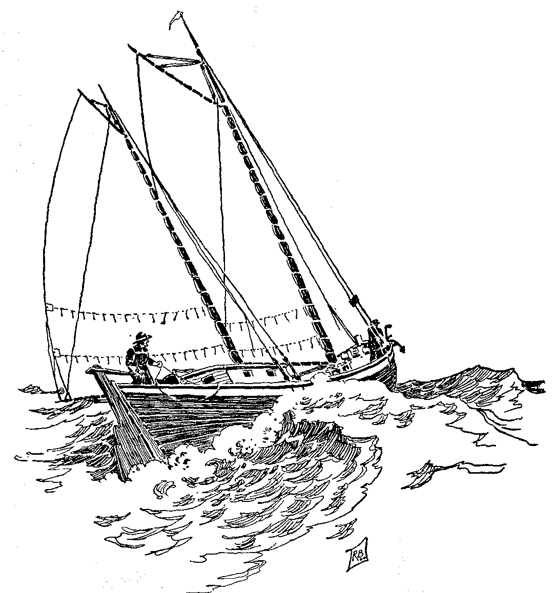 Three causes make the occupation of those fishermen who go for cod and halibut to the Newfoundland Banks extra hazardous—the almost continual fog, the swift steel Atlantic liners always plowing their way at high speed across the fishing grounds, heedless of fog or darkness, and the custom of fishing with trawls which must be tended from dories. The trawl, which is really only an extension of hand-lines, is a French device adopted by American fishermen early in the last century. One long hand-line, supported by floats, is set at some distance from Page 334the schooner. From it depend a number of short lines with baited hooks, set at brief intervals. The fisherman, in his dory, goes from one to the other of these lines pulling them in, throwing the fish in the bottom of the boat and rebaiting his hooks. When his dory is full he returns with his load to the schooner—if he can find her.