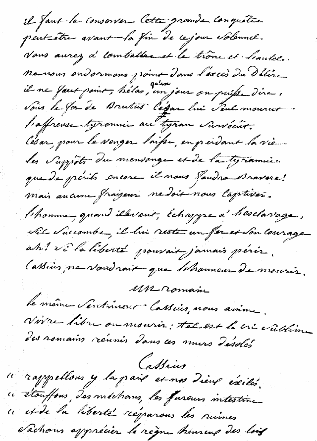 Les changements contenus dans ce dénouement dont j'ai ce jour donné copie à monsieur Grachot sont les seuls que je reconnaisse et qu'il ne faut pas confondre avec ceux qu'on a altérés et comprimés à mon insu à Commune Affranchie (Lyon) l'an second de la république,