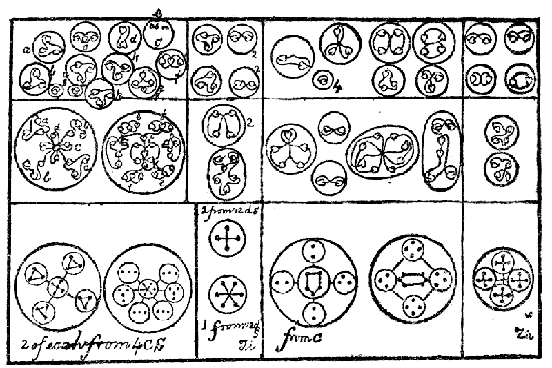 Since observation shows us that each physical atom is represented by forty-nine astral atoms, each astral atom by forty-nine mental atoms, and each mental atom by forty-nine of those on the buddhic plane, we have here evidently several terms of a regular progressive series, and the natural presumption is that the series continues where we are no longer able to observe it. Further probability is lent to this assumption by the remarkable fact that—if we assume one dot to be what corresponds to an atom on the seventh or highest of our planes (as is suggested in The Ancient Wisdom, p. 42) and then suppose the law of multiplication to begin its operation, so that 49 dots shall form the atom of the next or sixth plane, 2401 that of the fifth, and so on—we find that the number indicated for the physical atom (496) corresponds almost exactly with the calculation based upon the actual counting of the coils. Indeed, it seems probable that but for the slight growth of the three thicker wires of the atom the correspondence would have been perfect.