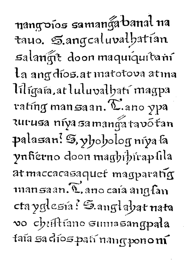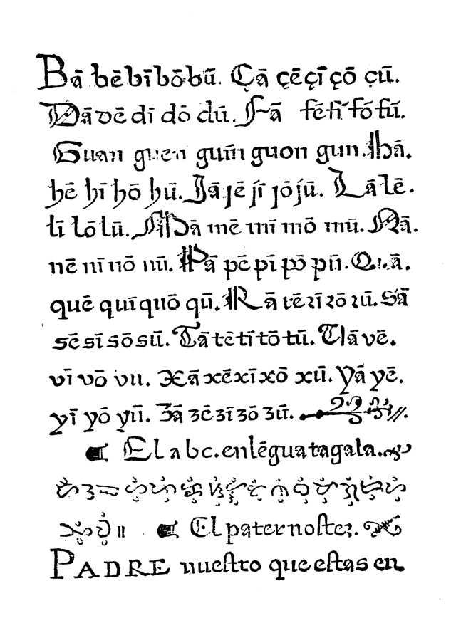 Chirino himself landed at Manila in 1590 shortly after Dasmariñas, and went almost immediately to Taytay where he learned Tagalog and was joined in 1592 by Martin Henriquez. At the time Juan de Oliver was preaching in that district, and it is exceedingly probable that he helped the newcomers with the language, for Chirino speaks of him in terms of highest praise. Henriquez “learned the language in three months and in six wrote a catechism in it, a confessionary, and a book of sermons for all the gospels of the year in the said idiom,”93 but he died on February 3, 1593 at Taytay. How thoroughly Chirino himself had grasped the fundamentals of Tagalog is evident from his three chapters94 on the language and letters [28] of the natives in which he prints the Ave Maria in Tagalog and reproduces the Tagalog alphabet—its first appearance in a European publication. But Chirino, who remained in the provinces until 1595, would have mentioned his participation and that of Henriquez in the Doctrina of 1593, so we record them as possible but not probable consultants.