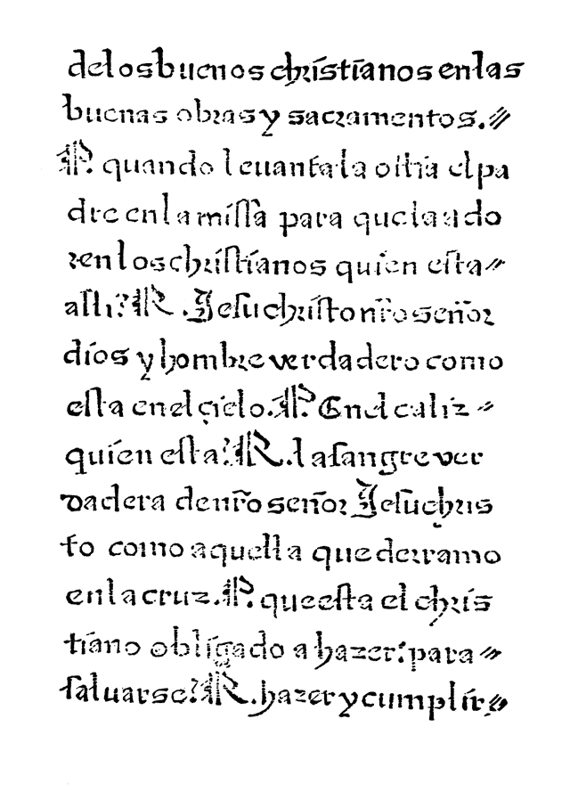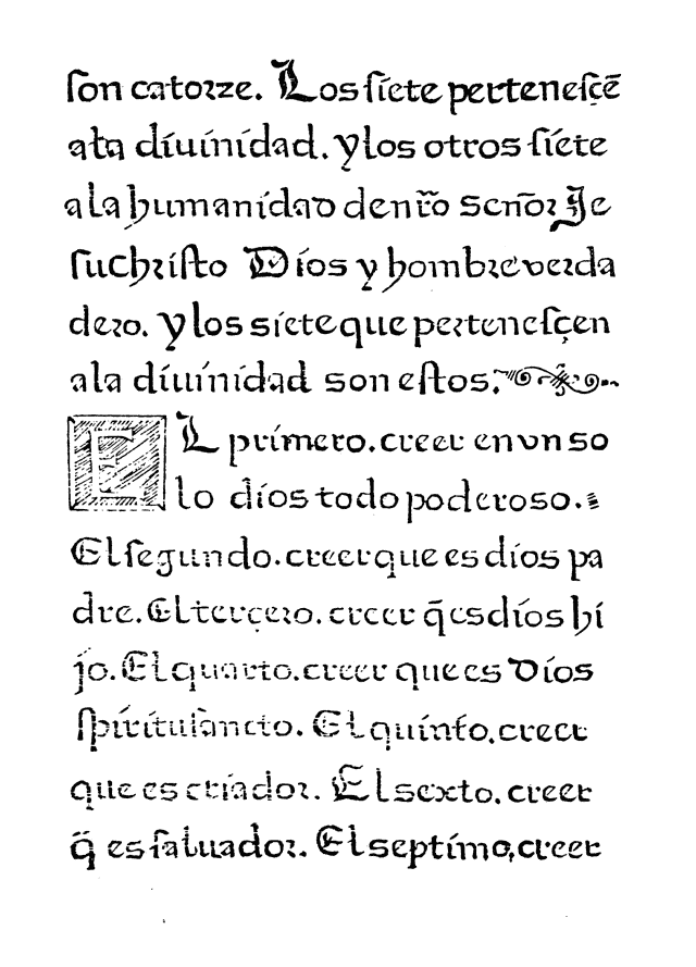 Because the Doctrina Christiana, which may well be translated “The Teachings of Christianity,” contains the basic elements of the religion which the missionaries were trying to spread among the unbaptized in the remote regions of the world, it was the most useful handbook they had. A summary of the contents of the present edition shows the fundamental character of the work. After a syllabary comes the Pater Noster, the primary and most popular prayer of Christianity. Then follow the Ave Maria, Credo, Salve Regina, Articles of Faith, Ten Commandments, Commandments of the Holy Church, Sacraments of the Holy Church, Seven Mortal Sins, Fourteen Works of Charity, Confession and Catechism. Here in a small compass is presented the simplest, most easily learned and most essential tenets of the Catholic Church.
