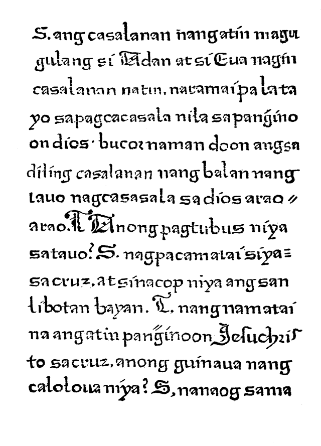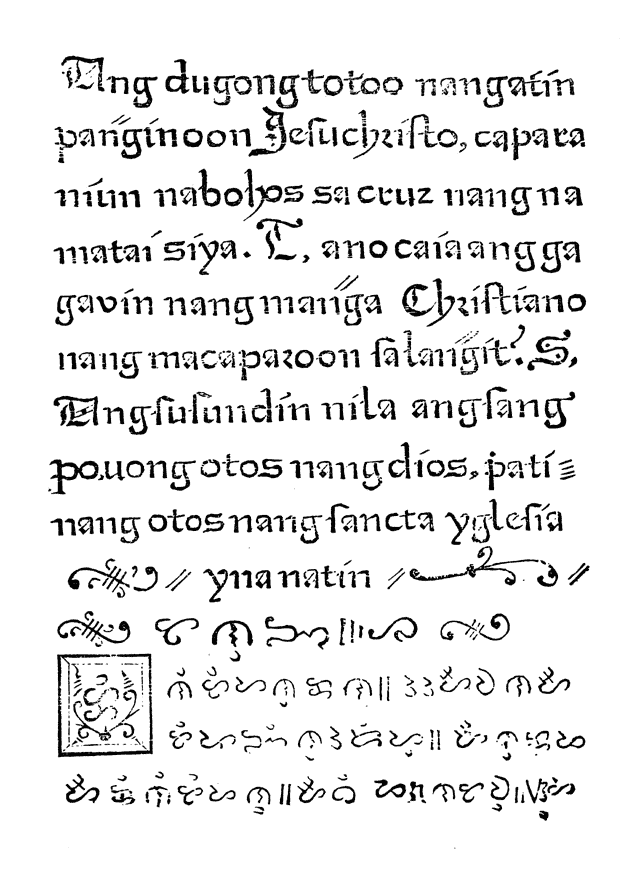 Notice: For proper display, this file requires a Unicode-aware old Tagalog (Baybayin) font to display correctly. Such fonts can be located on the internet by searching for download Baybayin font.