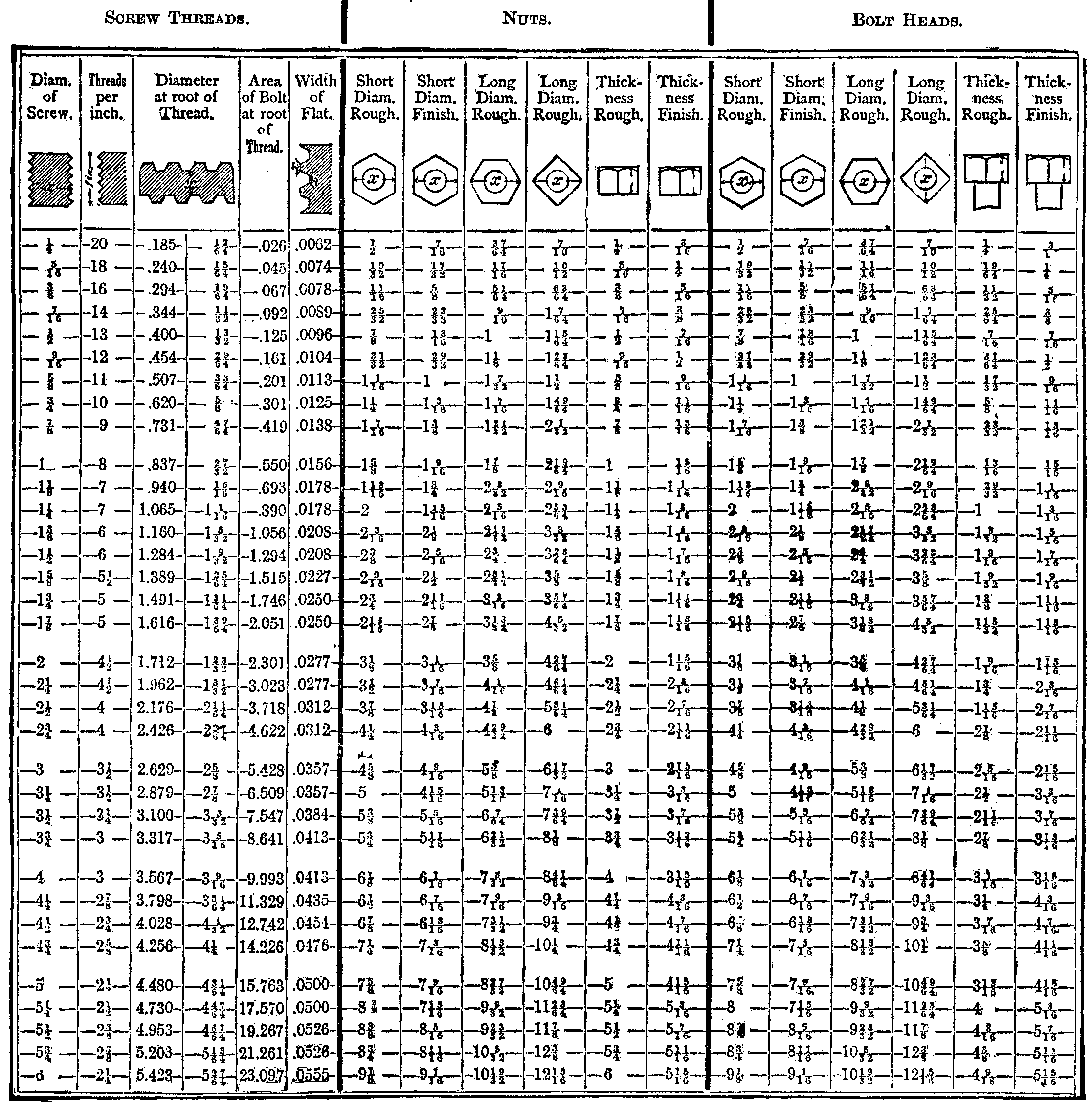 The dimensions given for diameter at root of threads are also those for diameter of hole in nuts and diameter of lap drills. All bolts and studs 3/4 in. diameter and above, screwed into boilers, have 12 threads per inch, sharp thread, a taper of 1/16 in. per 1 inch; tap drill should be 9/64 in. less than normal diameter of bolts.