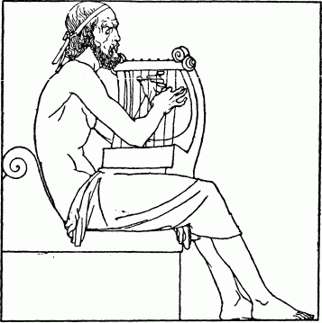 Phemius came and the wooers called upon him to sing them a tale. And the minstrel, in flowing verse, began the tale of the return of the Kings and Princes from Troy, and of how some god or goddess put a trouble upon them as they left the City they had taken. And as the minstrel began the tale, Penelope, Telemachus' lady-mother, was coming down the stairs with two hand-maids beside her. She heard the words he sang, and she stood still in her grief and drew her veil across her face. 'O Phemius,' she cried, 'cease from that story that ever wastes my heart—the story that has brought me sorrow and that leaves me comfortless all my days! O Phemius, do you not know other tales of men and gods that you might sing in this hall for the delight of my noble wooers?'
