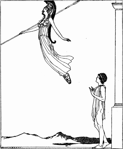 The stranger clasped his hands and went through the gate. And then, as he looked after him Telemachus saw the stranger change in his form. He became first as a woman, tall, with fair hair and a spear of bronze in her hand. And then the form of a woman changed too. It changed into a great sea-eagle that on wide wings rose up and flew high through the air. Telemachus knew then that his visitor was an immortal and no other than the goddess Athene who had been his father's friend.