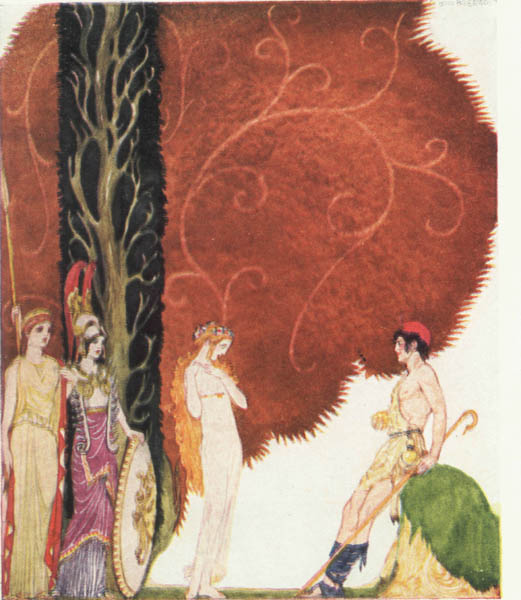 Said Hera to Paris, 'Award the apple to me and I will give you a great kingship.' Said Athene, 'Award the golden apple to me and I will make you the wisest of men.' And Aphrodite came to him and whispered, 'Paris, dear Paris, let me be called the fairest and I will make you beautiful, and the fairest woman in the world will be your wife.' Paris looked on Aphrodite and in his eyes she was the fairest. To her he gave the golden apple and ever afterwards she was his friend. But Hera and Athene departed from the company in wrath.