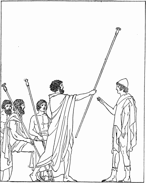 Telemachus was glad because of the kindly speech of the old man. He rose up to speak and the herald put a staff into his hands as a sign that he was to be listened to with reverence. Telemachus then spoke, addressing the old lord Ægyptus.