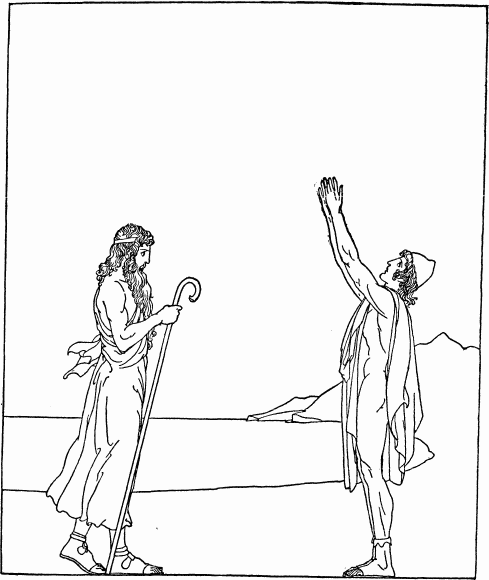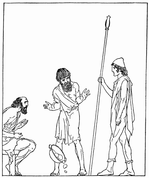 When the cattle-herd, Philœtius, saw a stranger in the guise of a beggar, he called out as he tethered the calf in the yard, 'Hail, stranger friend! My eyes fill with tears as I look on thee. For even now, clad as thou art in rags, thou dost make me think of my master Odysseus, who may be a wanderer such as thou in friendless lands. Ah, that he might return and make a scattering of the wooers in his hall.' Eumæus the swineherd came up to Philœtius and made the same prayer. These two, and the ancient woman at the quern, were the only ones of his servants whom he heard pray for his return.
