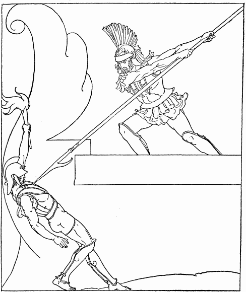 The stranger looked like one who would be a captain amongst soldiers. His eyes were grey and clear and shone wonderfully. In his hand he carried a great bronze spear. He and Telemachus went together through the court and into the hall. And when the stranger left his spear within the spearstand Telemachus took him to a high chair and put a footstool under his feet.