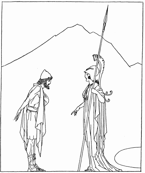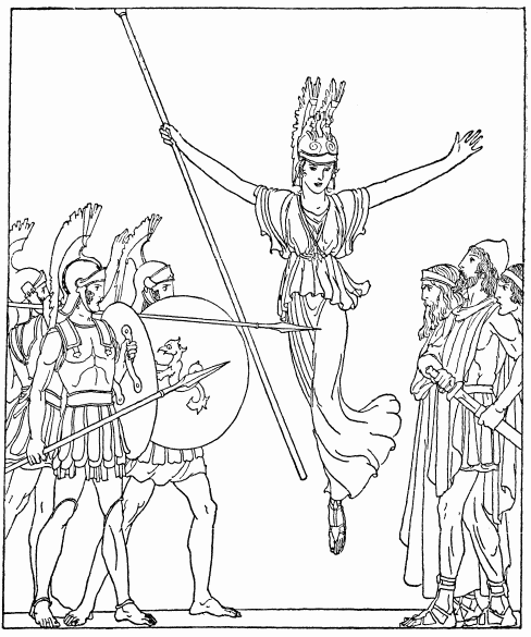 Now as the two bands came close to each other—Odysseus with Telemachus and Laertes; with the swineherd and the cattleherd; with Dolius, Laertes' servant, and with the six sons of Dolius—and Eupeithes with his friends—a great figure came between. It was the figure of a tall, fair and splendid woman. Odysseus knew her for the goddess Pallas Athene.