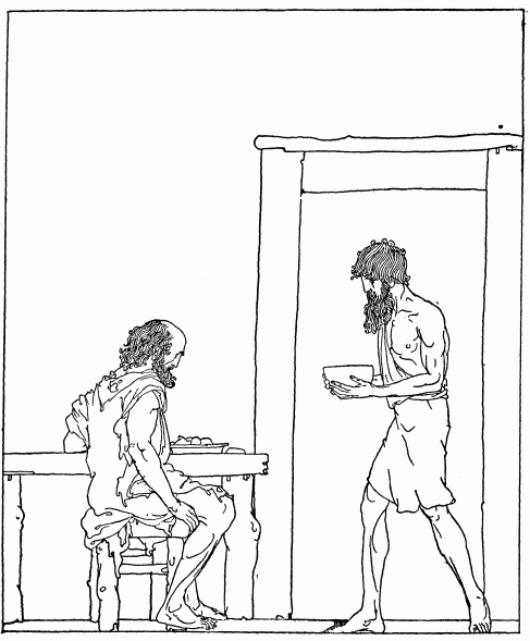 And now the wooers came into the hall. Philœtius the cattle-herd, and Melanthius the evil goatherd, went amongst them, handing them bread and meat and wine. Odysseus stood outside the hall until Telemachus went to him and brought him within.