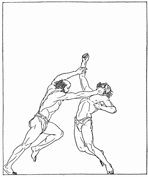 It was at Antinous he pointed the arrow—at Antinous who was even then lifting up a golden cup filled with wine, and who was smiling, with death far from his thoughts. Odysseus aimed at him, and smote him with the arrow in the throat and the point passed out clean through his neck. The wine cup fell from his hands and Antinous fell dead across the table. Then did all the wooers raise a shout, threatening Odysseus for sending an arrow astray. It did not come into their minds that this stranger-beggar had aimed to kill Antinous.