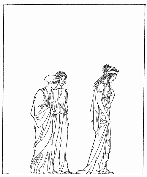 Then the minstrel sang of Peleus, the King of Phthia, and of his marriage to the river nymph, Thetis. All the gods and goddesses came to their wedding feast, Only one of the immortals was not invited—Eris, who is Discord. She came, however. At the games that followed the wedding feast she threw a golden apple amongst the guests, and on the apple was written "For the fairest."