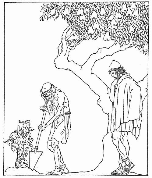 Now before anyone in the City knew that he had returned, Odysseus went forth to the farm that Laertes, his old father, stayed at. As he drew near he saw an old man working in the vineyard, digging round a plant. When he came to him he saw that this old man was not a slave nor a servant, but Laertes, his own father.