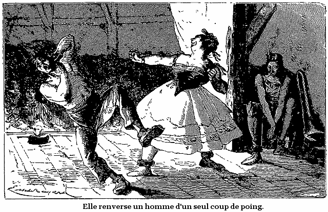 Sabin, lui, ne perdait point le temps en réflexions; il connaissait parfaitement la vérité que cherchait le bon gendarme; mais son intérêt n'était point de la divulguer. Il s'était approché traîtreusement des enfants, et là, un morceau de sucre entre les dents, un autre dans chaque main, il attendit que l'occasion se montrât propice. Elle ne tarda point. Les plus jeunes enfants de Lucifer faisaient tout leur possible pour battre mes amis; ceux-ci, obligés de repousser leurs attaques, ouvrirent imprudemment les bras. Au même instant Sabin enleva Balthasar qui, s'enlaçant après lui, se mit à lui lécher la figure et les mains. Le pauvre animal, qui jeûnait souvent depuis qu'il était devenu le pensionnaire de Lucifer, dévorait le sucre que Sabin avait entre les dents. Alors le bon public, celui qui jusque-là avait soutenu César et Aimée, tourna du côté de Lucifer, pour qui la partie était gagnée, et aussitôt un haro s'éleva contre mes malheureux amis et contre Jean, leur père adoptif.