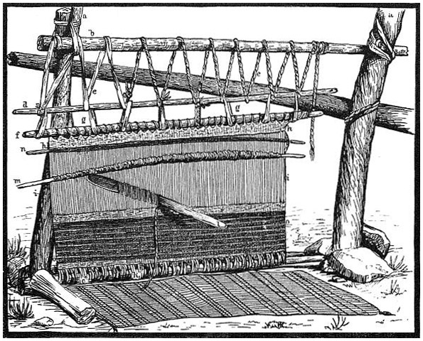 § V. The mode of applying the healds is simple: (1) the weaver sits facing the loom in the position for weaving; (2) she lays at the right (her right) side of the loom a ball of string which she knows contains more than sufficient material to make the healds; (3) she takes the end of this string and passes it to the left through the shed, leaving the ball in its original position; (4) she ties a loop at the end of the string large enough to admit the heald-rod; (5) she holds horizontally in her left hand a straightish slender rod, which is to become the heald-rod—its right extremity touching the left edge of the warp—and passes the rod through the loop until the point of the stick is even with the third (second anterior from the left) thread of the warp; (6) she puts her finger through the space between the first and third threads and draws out a fold of the heald-string; (7) she twists this once around, so as to form a loop, and pushes the point of the heald-rod on to the right through this loop; (8) she puts her finger into the next space and forms another loop; (9) and so on she continues to advance her rod and form her loops from left to right until each of the anterior (alternate) warp-threads of the lower shed is included in a loop of the heald; (10) when the last loop is made she ties the string firmly to the rod near its right end.