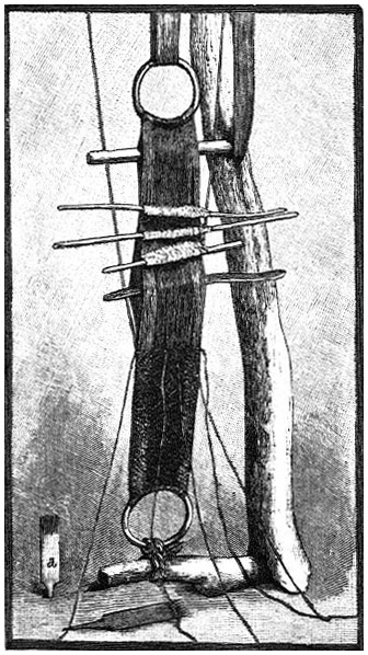 When the warp is transferred to the loom the rod which was placed in the upper shed remains there, or another rod, straighter and smoother, [Pg 380]is substituted for it; but with the lower shed, healds are applied to the anterior threads and the rod is withdrawn.