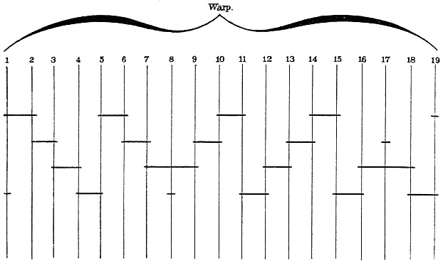 There is a variety of diagonal weaving practiced by the Navajos which produces diamond figures; for this the mechanism is the same [Pg 384]as that just described, except that the healds are arranged differently on the warp. The following diagram will explain this arrangement.