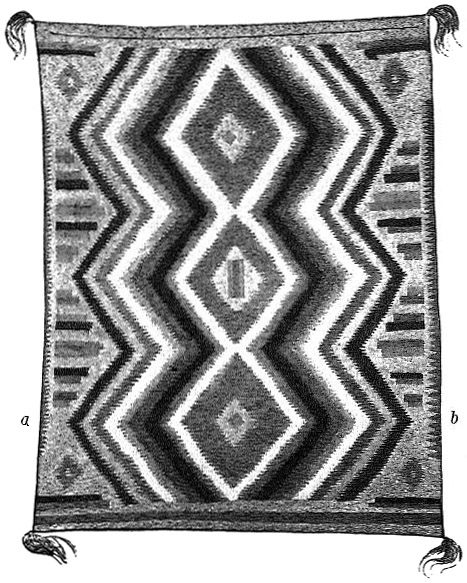 Navajo blankets are single-ply, with designs the same on both sides, no matter how elaborate these designs may be. To produce their varigated patterns they have a separate skein, shuttle, or thread for each component of the pattern. Take, for instance, the blanket depicted in Fig. 49. Across this blanket, between the points a—b, we have two serrated borders, two white spaces, a small diamond in the center, and twenty-four serrated stripes, making in all twenty-nine component parts of the pattern. Now, when the weaver was working in this place, twenty-nine different threads of weft might have been seen hanging from the face of the web at one time. In the girth pictured in Fig. 44 five different threads of woof are shown depending from the loom.