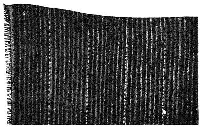 At this stage of the work these stout cords lie along the outer surfaces of the poles, parallel with the axes of the latter, but when the warp is taken off the poles and applied to the beams of the loom by the spiral thread, as above described, and as depicted in Plate XXXVIII and Fig. 42, and all is ready for weaving, the cords appear on the inner sides of the beams, i.e., one (Pl. XXXVIII and Fig. 42, h h) at the lower side of the yarn-beam, the other at the upper side of the cloth-beam, and when the blanket is finished they form the stout end margins of the web. In the coarser grade of blankets the cords are removed and the ends of the warp tied in pairs and made to form a fringe. (See Figs. 54 and 55.)