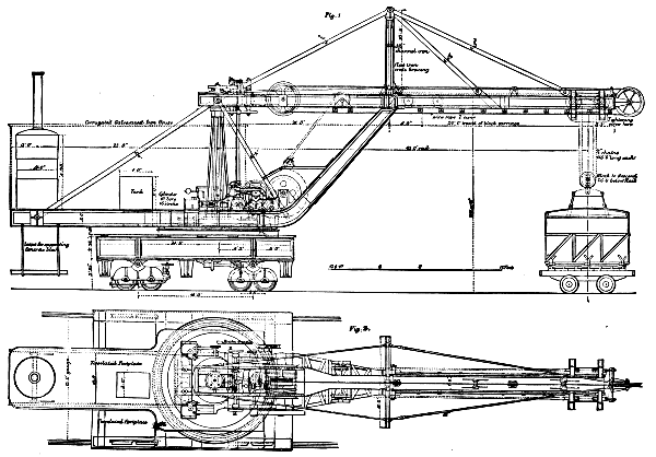 The general arrangement consists of a truck on which is fixed a post, round which the crane revolves; the jib is supported midway by an inclined strut, above which is placed the king-post; the strut is curved round at the bottom and forms one piece with the side frames, which are carried right back as a tail to support the boiler and balance weight.